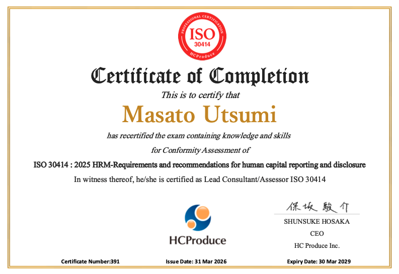 弊社代表 内海正人は、ISO 30414(人的資本報告・開示に関する要求事項と推奨事項)のコンフォーミティ・アセスメントに係るリードコンサルタント/アセッサー資格を更新いたしました。